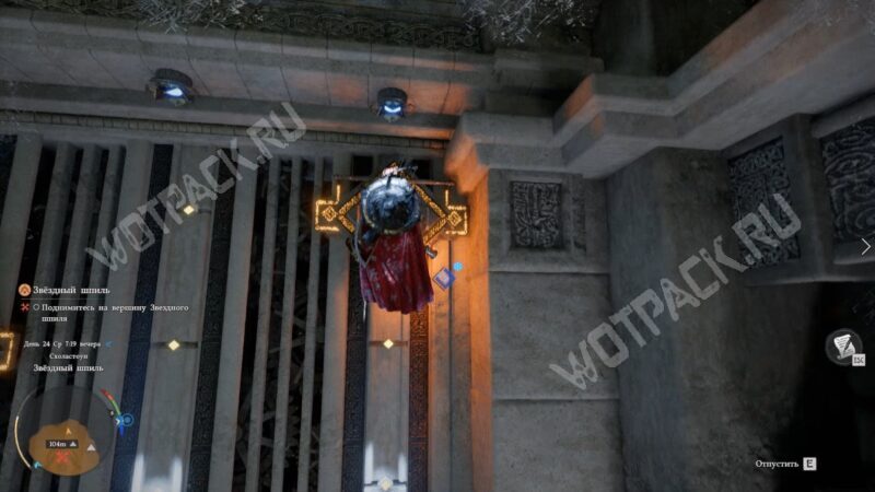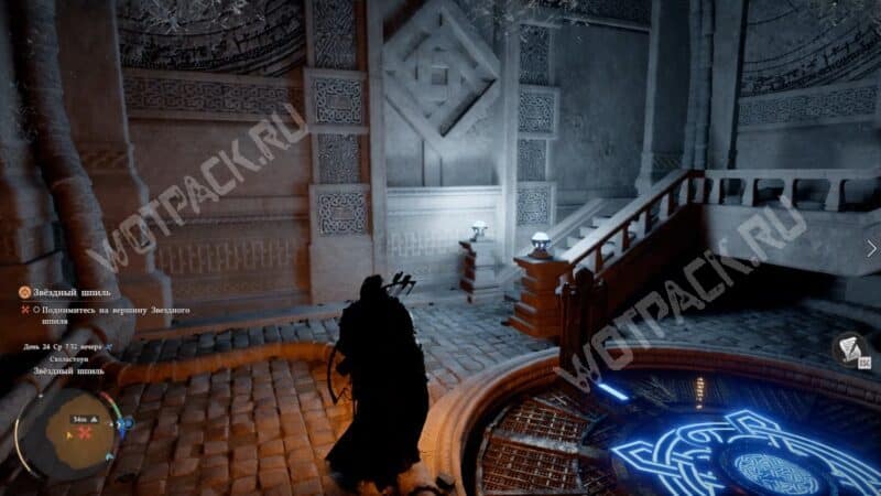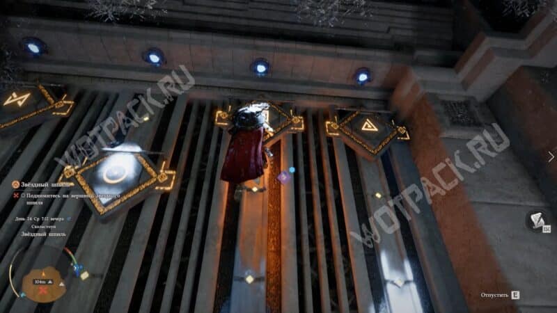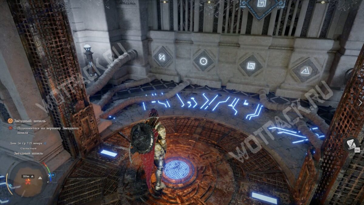 По синим узорам на полу поймёте, что лифт активирован. Встаньте на него и ждите, пока не поднимитесь на вершину Звездного шпиля.