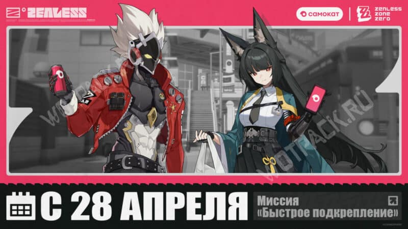 HoYoverse и сервис «Самокат» анонсировали акцию по Zenless Zone Zero «Миссия Быстрое подкрепление», которая начнется 28 апреля 2026 года. Согласно промо-арту коллаборации, игру могут представить киборг Билли и лисица Хосими Мияби — с высокой вероятностью в продаже появятся акриловые стенды, брелки или другой мерч с их изображением. Однако официальную информацию о сроках проведения мероприятия и запланированных активностях ещё не раскрывали.